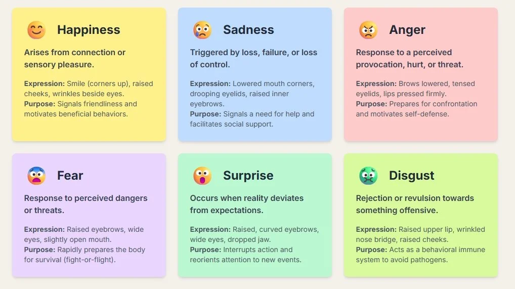 Happiness | Desirable, arises from connection/pleasure, ranges from peace to ecstasy, associated with reward. | Smile (corners pulled back & up), raised cheeks, wrinkles beside eyes ("crows feet" for Duchenne smile). | Feeling light/uplifted, energetic, buzzing/tingling, warm, grounded. | Signals friendliness, non-threat; motivates beneficial behaviors (reproduction, child-rearing); enhances memory. | Influences when and how intensely happiness is displayed publicly. |